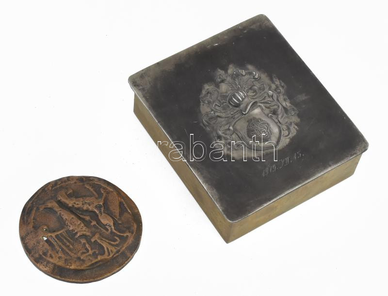 Leírás: Nemesi címeres fém ládika, benne sárkányos bronz levélnehezék 10x11 cm