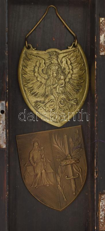 Leírás: Régi fadoboz, benne 2 darab bronz kegytárgy plakettel, doboz h: 25 cm, sérült, plakett h. 7-8 cm