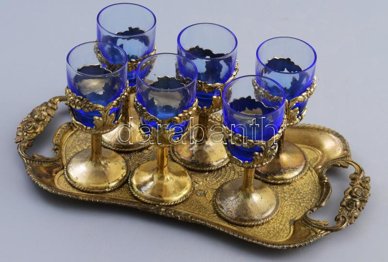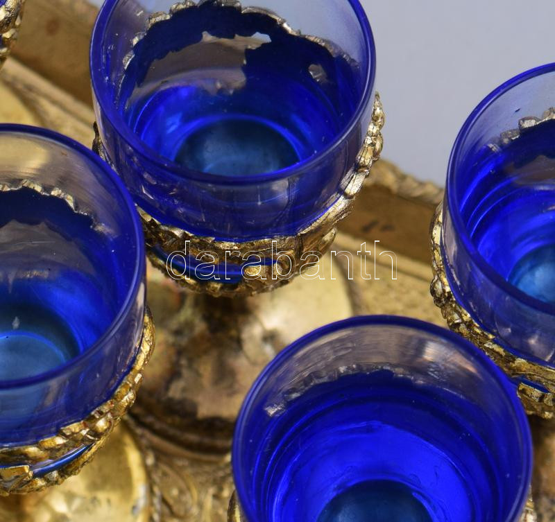 Leírás: Retro röviditalos szett, fém szerelékkel, kéküveg betétekkel, tálcán, pohár m: 9 cm
