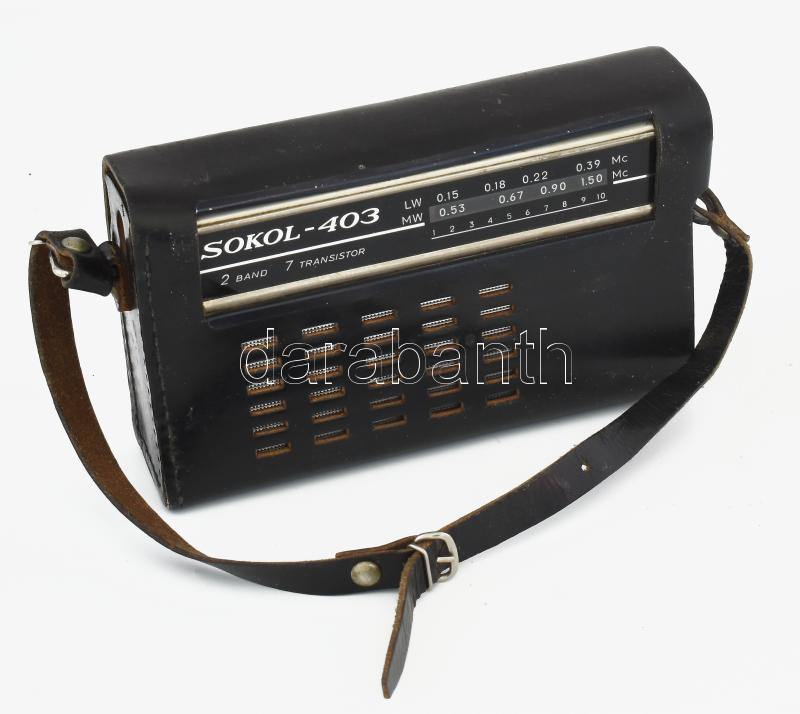 Sokol 403 rádió, barna bőr tokban, 17x10 cm