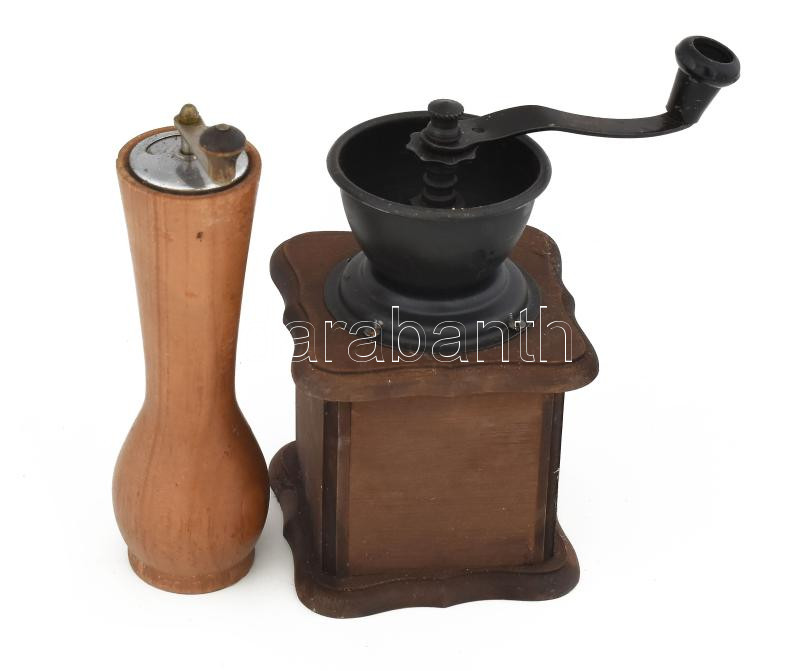 Leírás: Tekerős asztali daráló., fa, fém. 18 cm + Tekerős bors daráló 17 cm
