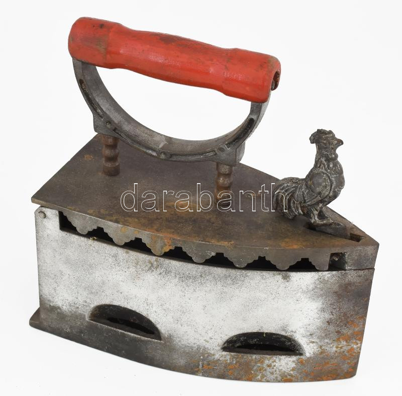 Leírás: Vas szenes vasaló, kakasfigurás billentővel 21x21 cm