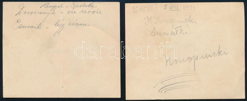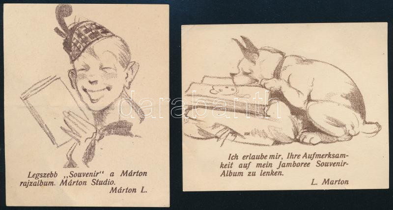 Leírás: 2 db Márton Lajos grafikáival illusztrált reklámlap, az egyik hátoldalán 1933-as gödöllői feljegyzéssel, 9,5x7,5 cm