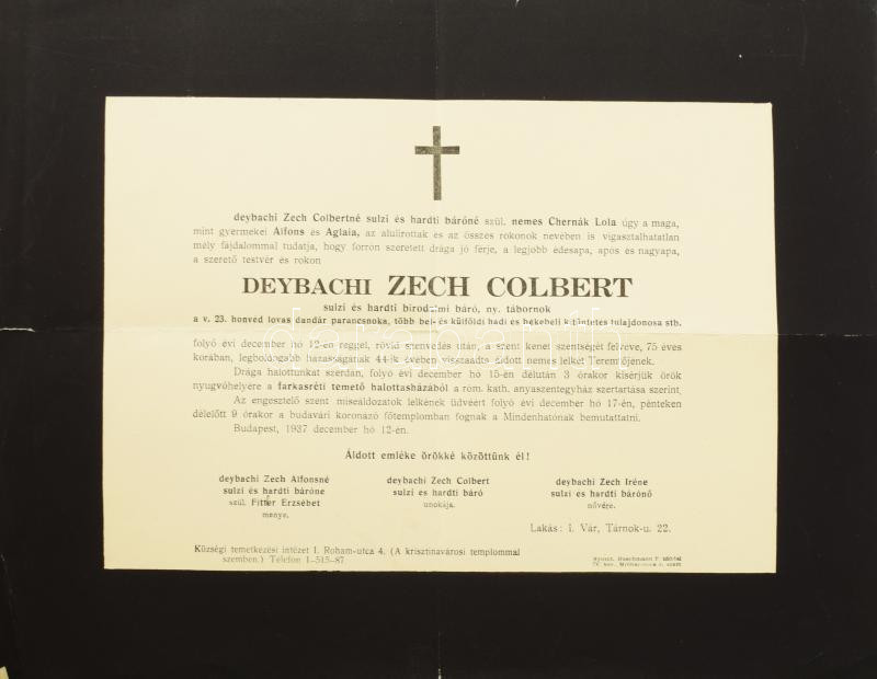Leírás: 1937 deybachi báró Zech Colbert ny. tábornok, a volt 23. honvéd lovasdandár parancsnoka gyászjelentése, kisebb lapszéli sérülésekkel, 30x22,5 cm