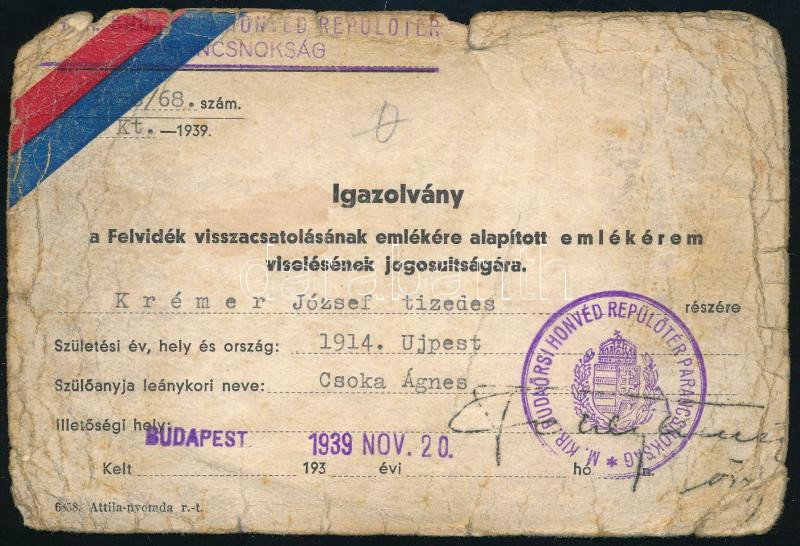 Leírás: 1939 Bp., Igazolvány Felvidék visszacsatolásának emlékére alapított emlékérem viselésének jogosultságáról, megviselt állapotban