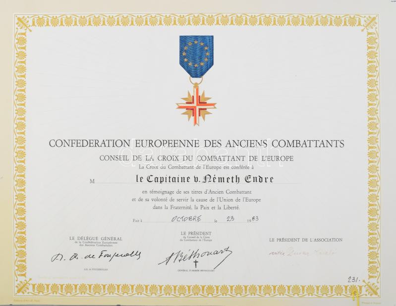 Leírás: 1983 Confederation Europeene des Anciens Combatants - háborús harcosok szövetségének oklevele magyar személy részére 43x33 cm