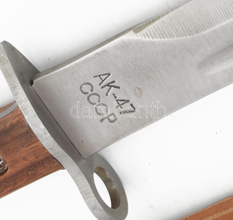 Szovjet AK-47 gépkarabély bajonett, fa/fém markolattal, h: 51 cm műbőr... https://www.darabanth.com/hu/475-Gyorsarveres/475.0/Mutargy-papirregiseg-egyeb/Militaria~1000008/Szovjet-AK-47-gepkarabely-bajonett-fafem-markolattal-h-51-cm-mubor-tokkal~II3223974