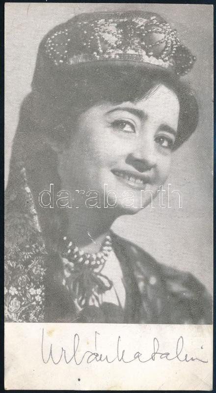 Leírás: Urbán Katalin (1921-2011) nótaénekesnő autográf aláírása őt ábrázoló képen, 16x8,5 cm