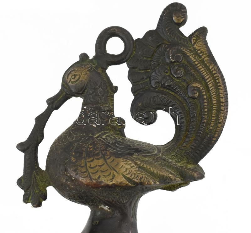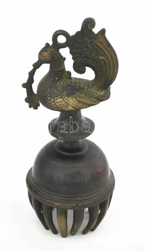 Leírás: Antik indiai bronz csengő, kézi harang, Madár ábrázolással, gazdagon díszített 25 cm