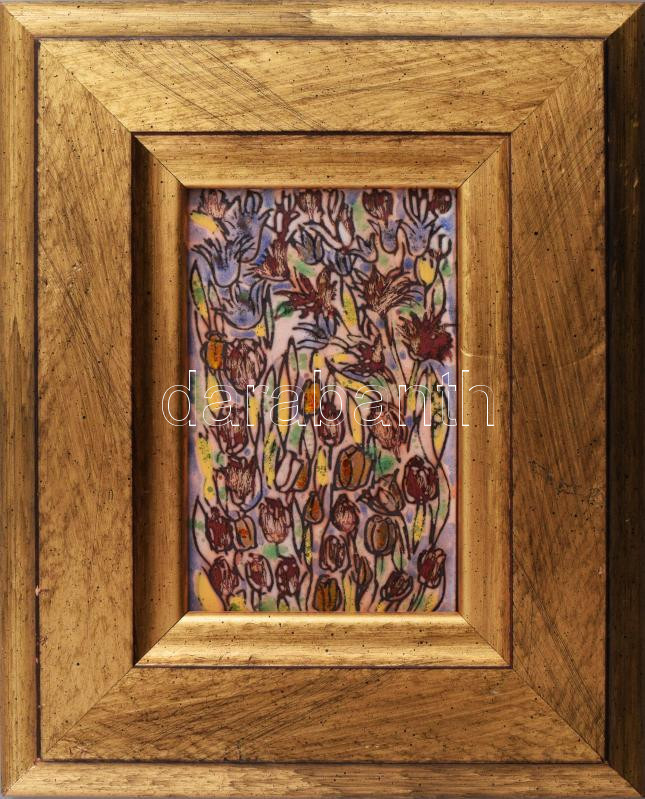 Leírás: Glar? Margit: Virágoskert. Tűzzománc kép, dekoratív keretben, 14x9 cm, kerettel, 26x22 cm