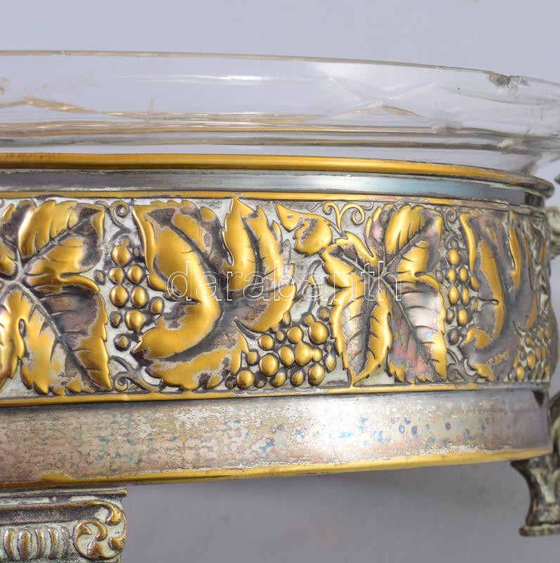 Leírás: Szecessziós asztalközép kínáló, ezüstözött lemez, üveg betéttel, lepattanással, h: 41 cm, m: 12 cm