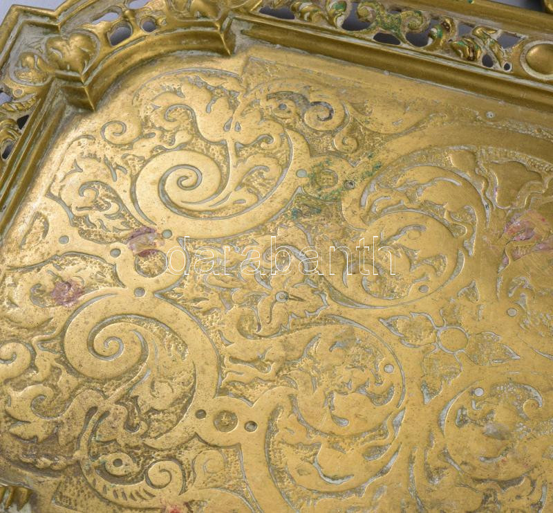 Leírás: cca 19. sz. vége, Szecessziós bronz asztali szett, tálca, gyufatartó, gyertyatartó, tálca 40x21 cm