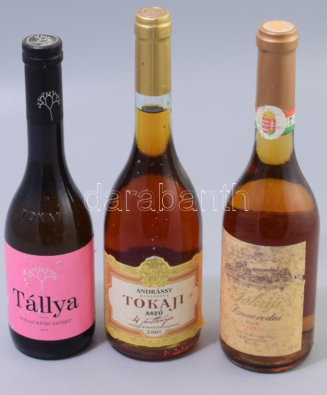 Leírás: 2006 Andrássy Tokaji aszú 4 puttonyos + 1992 Tokaji Szomorodni, Hungarovin + 2015 Tállya tokaji kései szüret, mind bontatlan.