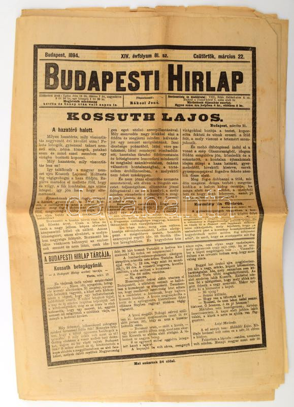 1894 Budapesti Hírlap XIV. évf. 81. száma, 1894. március 22., benne Kossuth Lajos holttestének hazahozatalával és temetésével kapcsolatos beszámolóval, kisebb sérülésekkel, foltokkal, 24 p.