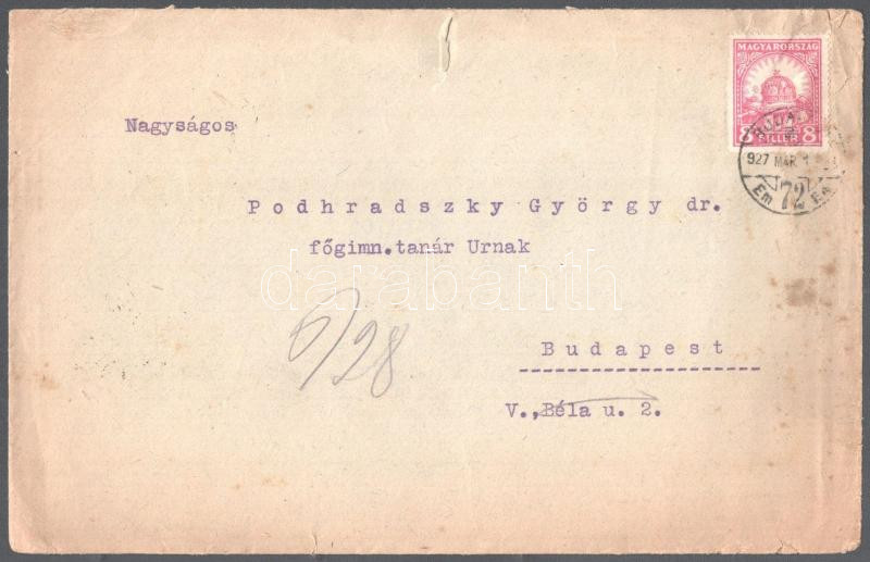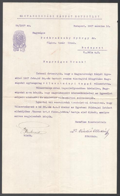 1927 Podhradszky György (1889-1972) újságíró, muzeológus, a Slovenské noviny főszerkesztőjenek írt levél a Magyarországi Kárpát Egyesülettől, melyben értesítik, hogy tagjává választották