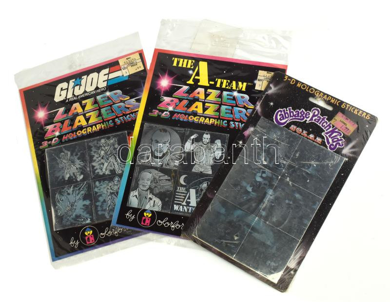 Leírás: 3 csomag 3D-s holografikus matrica: Lazer Blazers - G.I. Joe, The A-Team + Cabbagge Patch Kids Solar Glowers