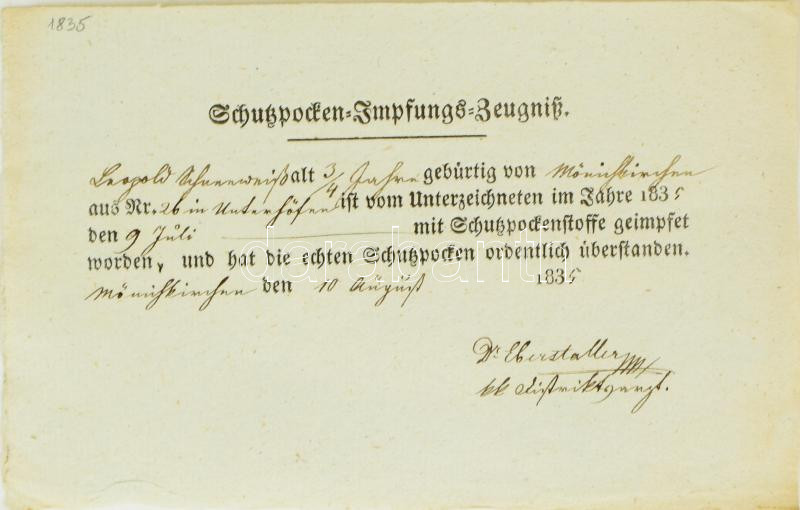 Leírás: 1835 ,,Schutzpocken-Impfungs-Zeugniss", igazolás himlő elleni védőoltásról, német nyelven, ,,Dr. Eberstaller" aláírással / Smallpox vaccination certificate