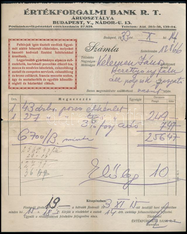 Leírás: 1933 Bp., Értékforgalmi Bank R.T. áruosztálya fejléces számla, részletre vásárolt porcelán (ét- és teás-) készletekről