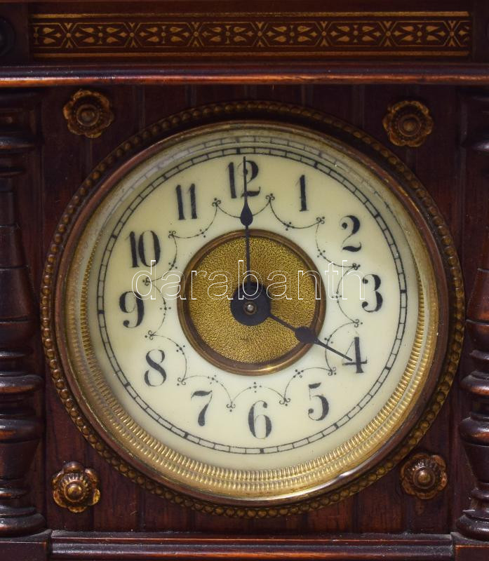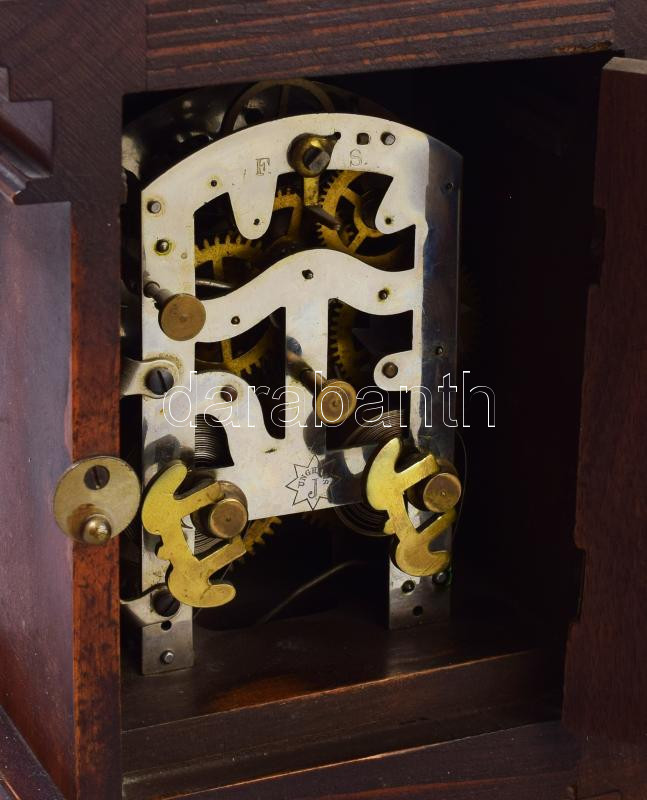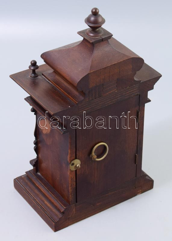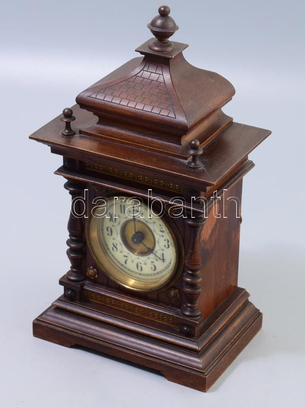 Leírás: Junghans asztali óra. Utazóóra felesütős szerkezettel, rugó járatos. szép porcelán számlappal, faragott fa tokkal. 28 cm
