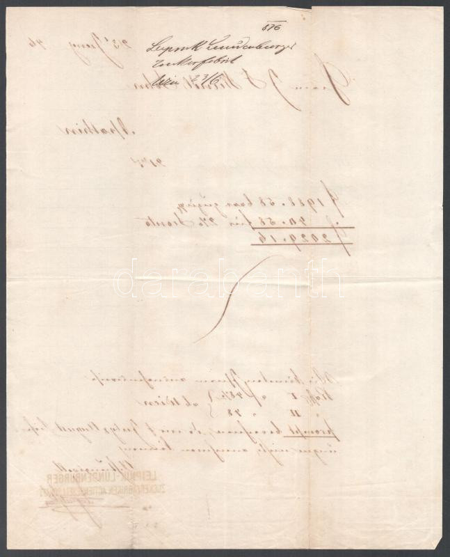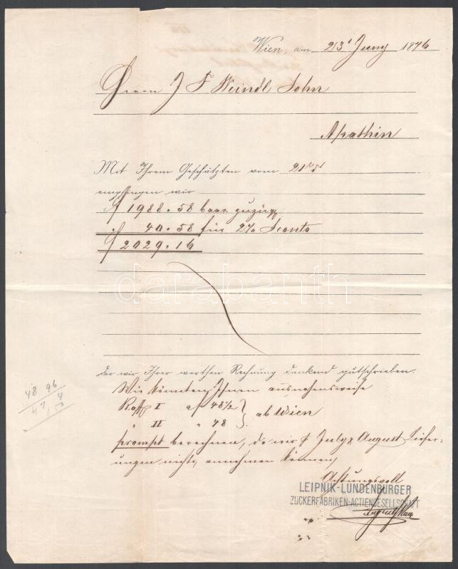 Leírás: 1874 Bécs, Leipnik-Lundenburger cukorgyár fejléces számla