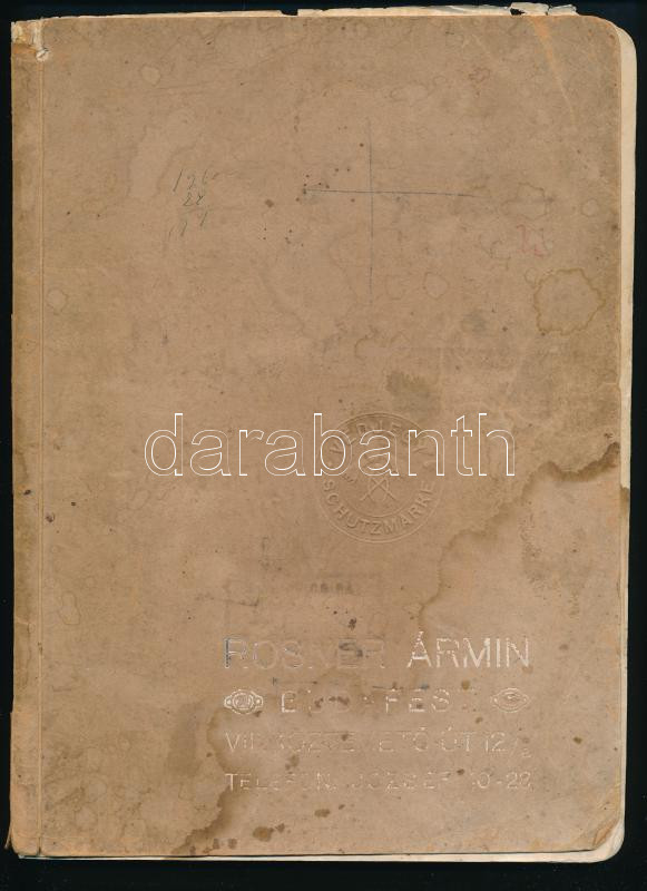 1913 Rosner Ármin árjegyzék. I. rész.: Kőfaragók és kellékek. Armin Rosner Preiscourant I. Teil: Spezialartikel der Steinindustrie. Nagyvárad, Lévai Márton-ny., 80 p. Gazdag képanyaggal. Magyar és német nyelven. Papírkötés, kopott, foltos borítóval, a hátsó borítón bélyegzésekkel, foltos lapokkal, a címlap és a 73. oldal között kijáró füzettel, az utolsó néhány lapon javításnyomokkal, az utolsó lapon bélyegzésekkel, a füzet felső sarkán lyukkal, rossz állapotban.
