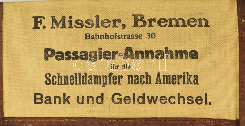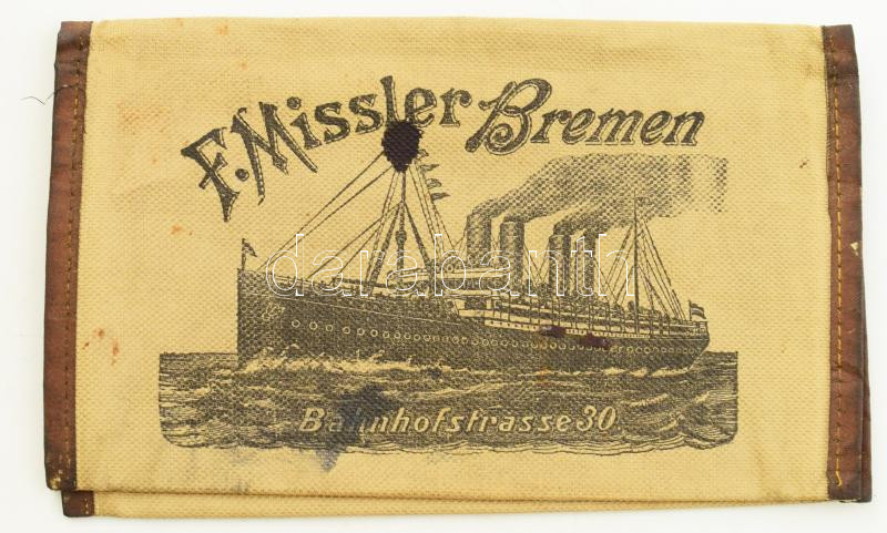 cca 1914 F. Missler-Bremen tengerjáró hajó jegy tartó, szövet 19x11 cm https://www.darabanth.com/hu/475-Gyorsarveres/475.0/Mutargy-papirregiseg-egyeb/Reklam~1000001/cca-1914-F-Missler-Bremen-tengerjaro-hajo-jegy-tarto-szovet-19x11-cm~II3230250