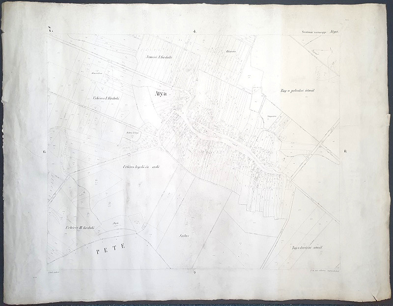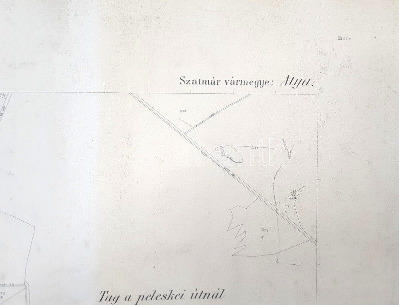[Térkép] A Szatmár vármegyei Atya község határának tagosítási térképe: Belterület és peleskei, daróczi, valamint úrbéres és nemesi dűlők (1903) [Budapest], 1903. Magyar Királyi Állami Nyomda. Kőnyomat, mérete: 525x655 mm egy 655x865 mm méretű térképlapon. Adózási célból készült, nagy felbontású, hozzávetőlegesen 1: 2850 léptékű kőnyomatú térképünk a Szatmár vármegyei Atya község belterületét, illetve a környező dűlőket, erdőket, legelőket ábrázolja. A magyar határ közvetlen közelében fekvő szamosközi település egykor a csengeri járáshoz tartozott, és élénkebb közlekedése is lehetett, a döntően magyar nyelvű település zsákfaluként a mellőzöttség és az elszegényedés nyomait mutatja, településszerkezete a felmérés óta eltelt 120 évben nem változott, a telkek, házhelyek jobbára azonosak ma is, az utak mennyisége pedig nem nőtt. Térképünkön magassági adatok, utak, fahidak, házhelyek, telkek és dűlők egyaránt jelezve, egyes udvarokon a művelődési ágak, kertek, gyümölcsösök jelezve, a határdűlők növénytakarójáról is néhány jelzés, valamint tájékozódási pont gyanánt a környék gémeskutai feltüntetve. A nemesi dűlők jelenléte térképünkön érdekes társadalomtörténeti részlettel szolgál: szamosközi vidékünkön tehát bőségesen éltek nadrágszíjparcellán ülő, elszegényedett nemesek is. Térképünk lajstromszáma a bal felső sarokban, a térkép keretén szelvényszámok, melyek segítségével a szamosközi vidék térképállománya összeállítható. Térképünk szélén apró sérülések, a szövegtükör egészén halvány foltosság. ([Szamosköz]. 7. térkép.) Jó állapotú lap.