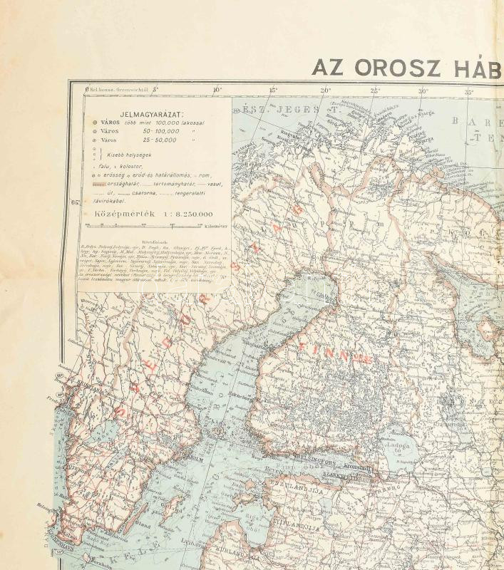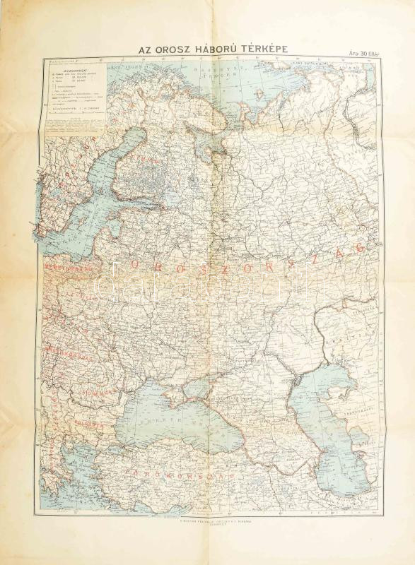 Leírás: cca 1914 Az orosz háború térképe, 1 : 8.250.000, Bp., Magyar Földrajzi Intézet Rt., minimális sérülésekkel, kissé foltos, 64x47,5 cm