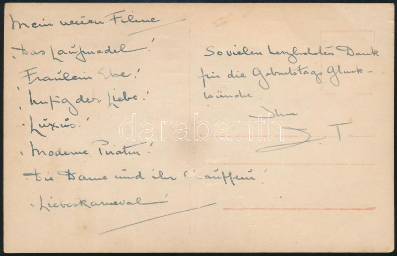cca 1928 Jack Trevor (1893-1976) brit filmszÃnész autográf német ny. dedikációja Å‘t magát ábrázoló képeslapon, hátoldalán az új filmjei felsorolásával és további autográf köszönÅ‘ sorokkal, amelyben apró kopással / autograph dedication and lines on both sides postcard