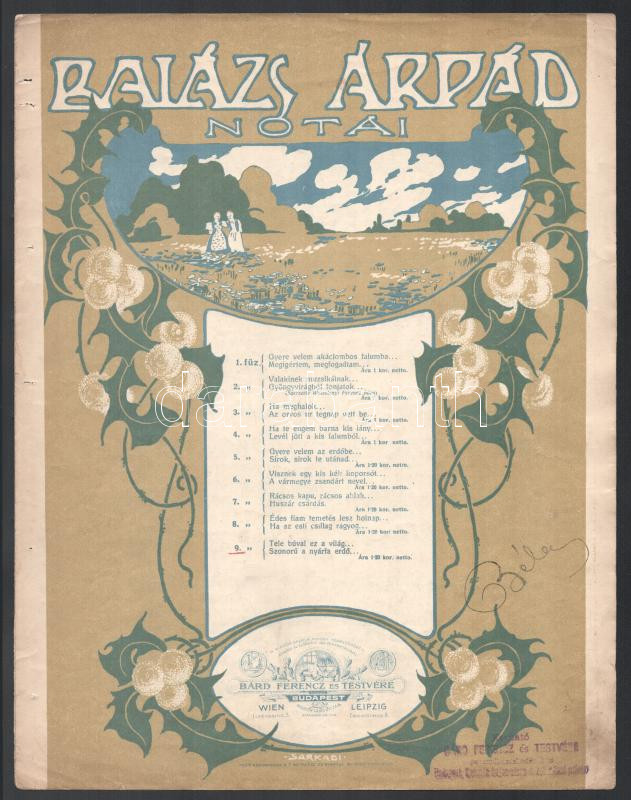 Leírás: Balázs Árpád nótái, kiadja: Bárd Ferencz és Testvére kotta, lyukasztásokkal