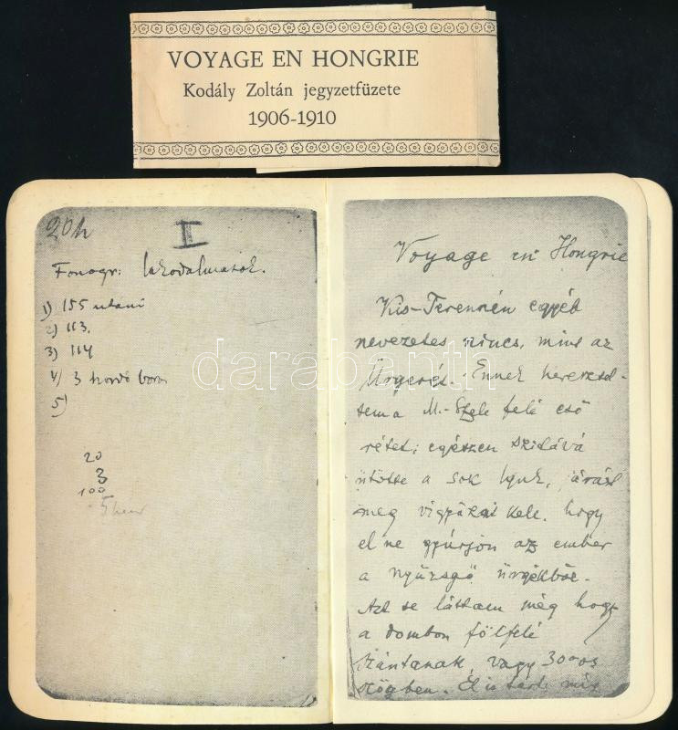 Kodály Zoltán: Voyage en Hongrie. Magyarországi utazás. - - jegyzetfüzete 1906-1910. Szerk., a képeket vál. és az utószót írta: Sz. Farkas Márta. Bp., 1983, Múzsák. Fekete-fehér fotókkal, Kodály Zoltán eredeti kéziratának hasonmásaival. Kiadói papírkötés, jó állapotban, sérült kiadói papírszalaggal.
