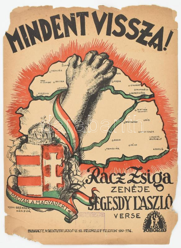 cca 1930 Mindent vissza! Irredenta kotta, sérült. https://www.darabanth.com/hu/475-Gyorsarveres/475.0/Mutargy-papirregiseg-egyeb/Zenetortenet-Kottak-Hangszerek~1000010/cca-1930-Mindent-vissza-Irredenta-kotta-serult~II3230361