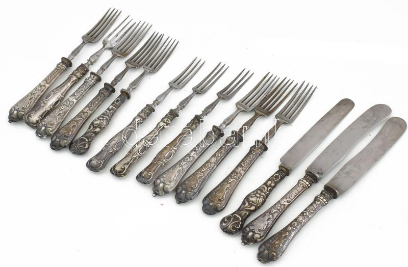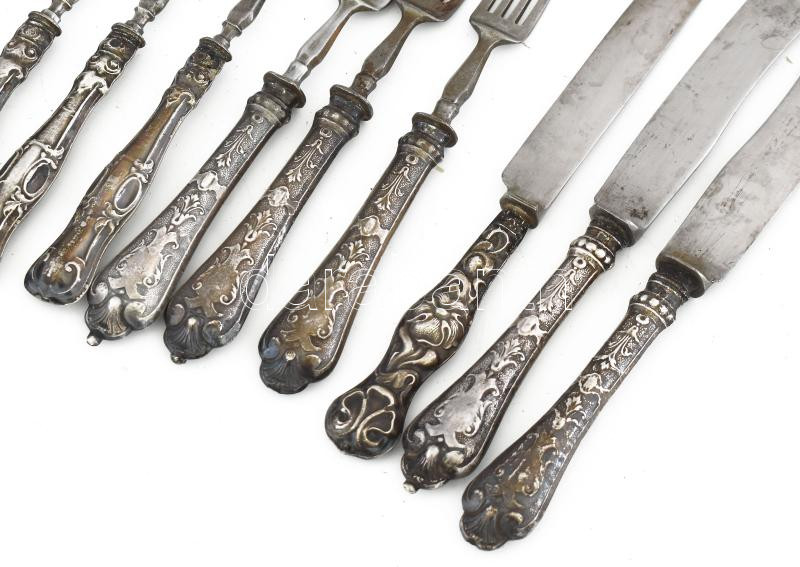 Leírás: 14 darab ezüst (Ag) nyelű villa és kés, részben jelzett.