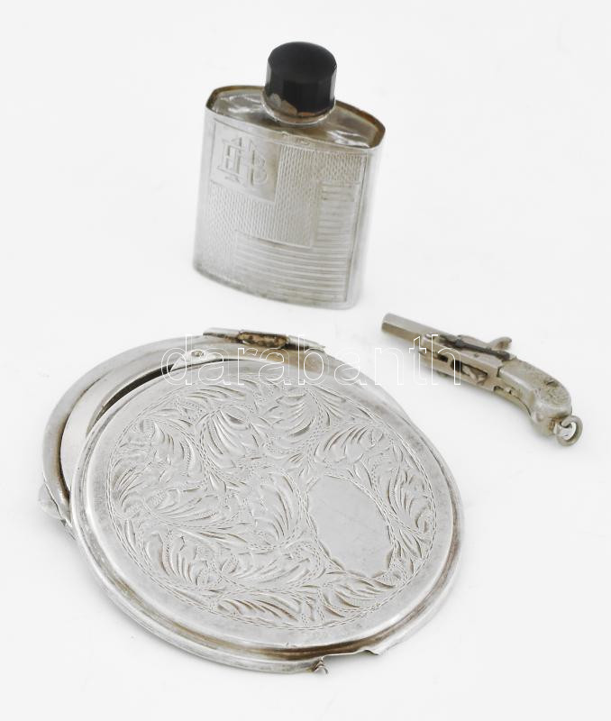 Leírás: 3 darab régi német / osztrák tárgy, a pudrié külső része és a parfümös fiola borítólemeze ezüst (Ag)