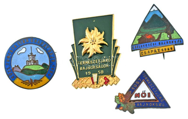 Leírás: 1957-1959. 4xklf természetjáró/turista jelvény, közte 3db zománcozott darabbal T:AU,XF közte zománchiba