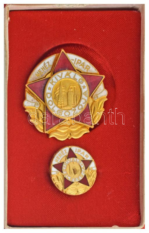 Leírás: ~1960. "Nehézipar Kiváló Dolgozója" zománcozott, aranyozott fém jelvény miniatűrrel, dísztokban T:AU