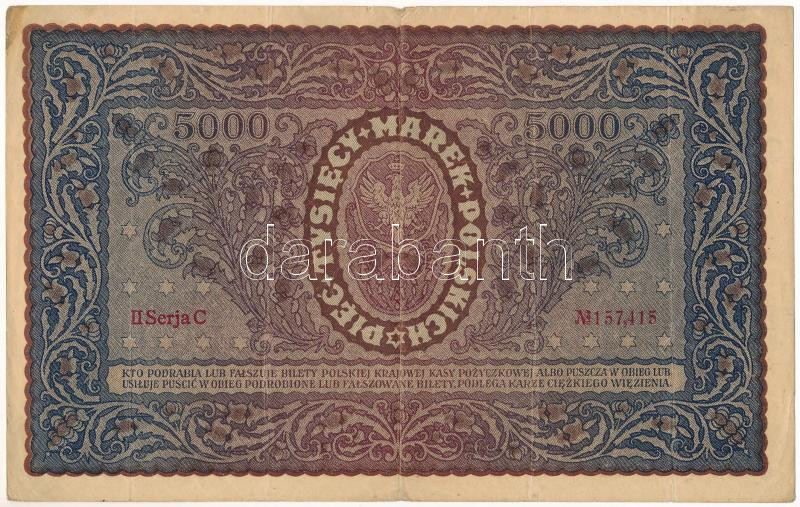Lengyelország 1920. 5000M "II C 157,415" T:F Poland 1920. 50... https://www.darabanth.com/hu/475-Gyorsarveres/475.0/Numizmatika/Kulfoldi-bankjegyek~2000016/Lengyelorszag-1920-5000M-II-C-157-415-TF-Poland-1920-5000-Marek-II-C-157-415-CF-Krause-P2331~II3203219
