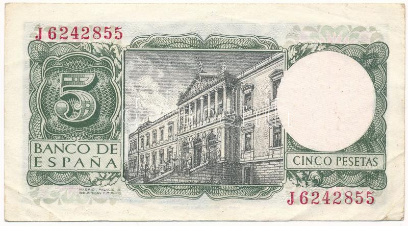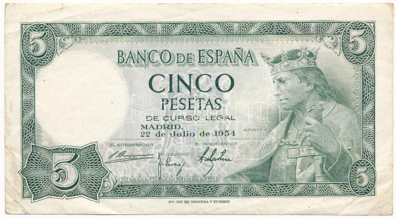 Spain 1954. 5 Pesetas ... https://www.darabanth.com/hu/475-Gyorsarveres/475.0/Numizmatika/Kulfoldi-bankjegyek~2000016/Spanyolorszag-1954-5P-TVF-F-tobb-sarokhajlas-Spain-1954-5-Pesetas-CVF-F-few-corner-folds-Kr~II3209637