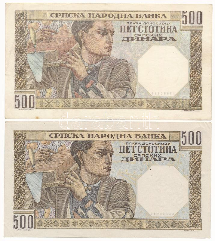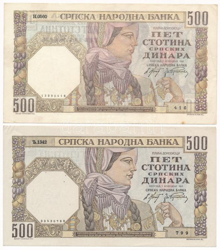Szerbia / Német megszállás 1941. 500D (2x) klf vízjellel T:XF,F Serbia / German Occupation 1941. 500 Dinara (2x) with diff watermark C:XF,F Krause P#27