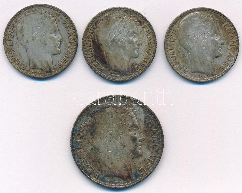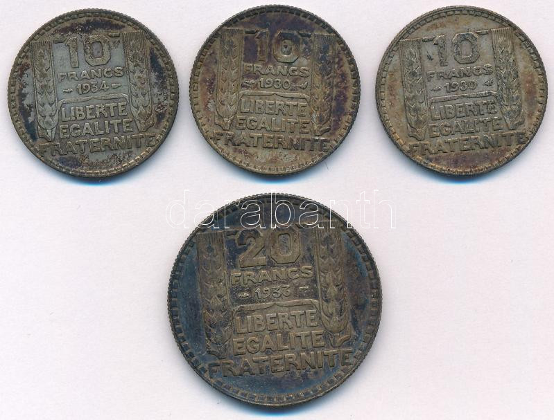 Franciaország 1930. 10Fr Ag (2x) + 1934. 10Fr Ag + 1933. 20Fr Ag T:VF,F patina