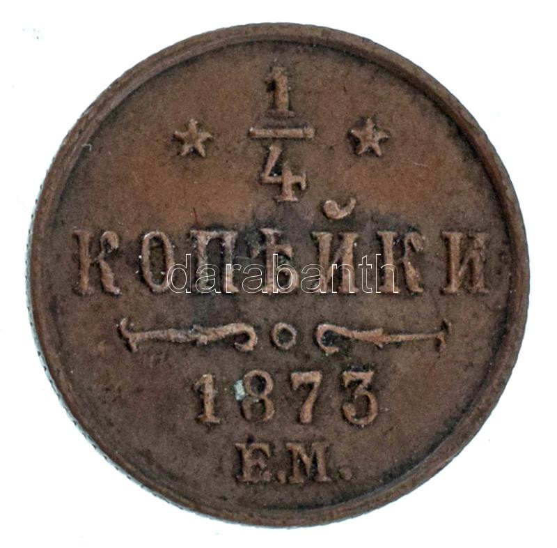 Orosz Birodalom 1873EM 1/4k Cu "II. Sándor" T:XF patina / Ru... https://www.darabanth.com/hu/475-Gyorsarveres/475.0/Numizmatika/Kulfoldi-fem-es-ezustpenzek~2000017/Orosz-Birodalom-1873EM-14k-Cu-II-Sandor-TXF-patina-Russian-Empire-1873EM-14-Kopeck-Cu-Alex~II3226329