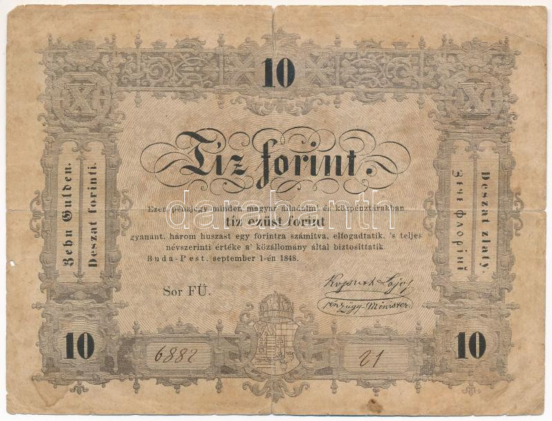 Leírás: 1848. 10ft "Kossuth bankó" "FÜ. 6882 21" T:VG hajtás mentén szakadás