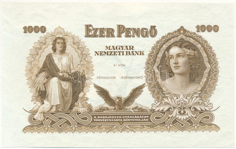 Leírás: 1942. 1000P tervezet próbanyomata, csak előlapi nyomat, utánnyomás Dr. Gara Miklós (szerk.): Nyomdaipari Enciklopédia című kötetből T:AU
