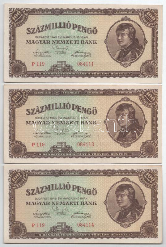 1946. 100.000.000P (3x) sorszámkövető pár + 1db egyugrásos sorszámmal ... https://www.darabanth.com/hu/475-Gyorsarveres/475.0/Numizmatika/Magyar-bankjegyek~2000009/1946-100000000P-3x-sorszamkoveto-par-plus-1db-egyugrasos-sorszammal-P119-084111-P119-0841~II3226997