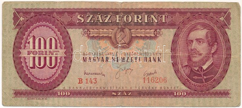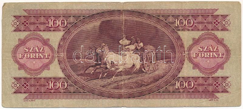 1949. 100Ft "B 143 006206" T:F,VG Adamo F28 https://www.darabanth.com/hu/475-Gyorsarveres/475.0/Numizmatika/Magyar-bankjegyek~2000009/1949-100Ft-B-143-006206-TF-VG-Adamo-F28~II3205288