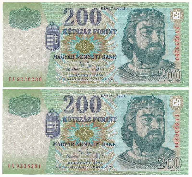 Leírás: 2005. 200Ft 2x sorszámkövetők "FA 9236280 - FA 9236281" T:UNC