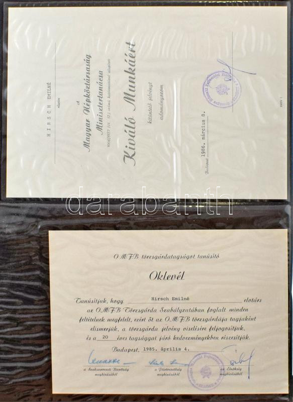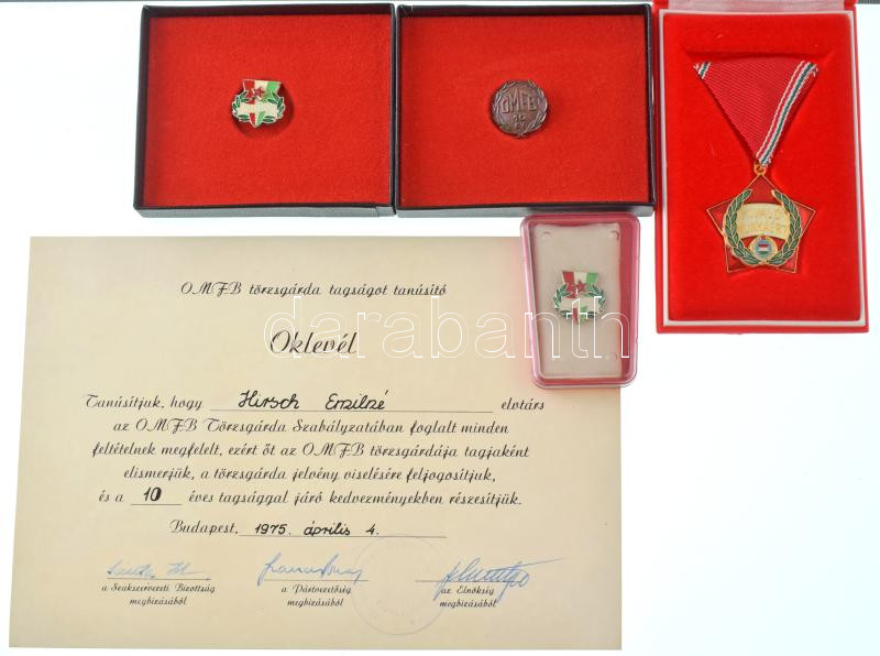Leírás: 1975. "OMFB (Országos Műszaki Fejlesztési Bizottság) - 10 éves Törzsgárda" bronz kitüntető jelvény eredeti tokban, adományozói okirattal + 1985. "Törzsgárda" (2db) jelvény tokban, egyikhez adományozói okirat + 1986. "Kiváló Munkáért" műgyantás fém kitüntetés mellszalagon, eredeti tokban, adományozói okirattal T:UNC,AU