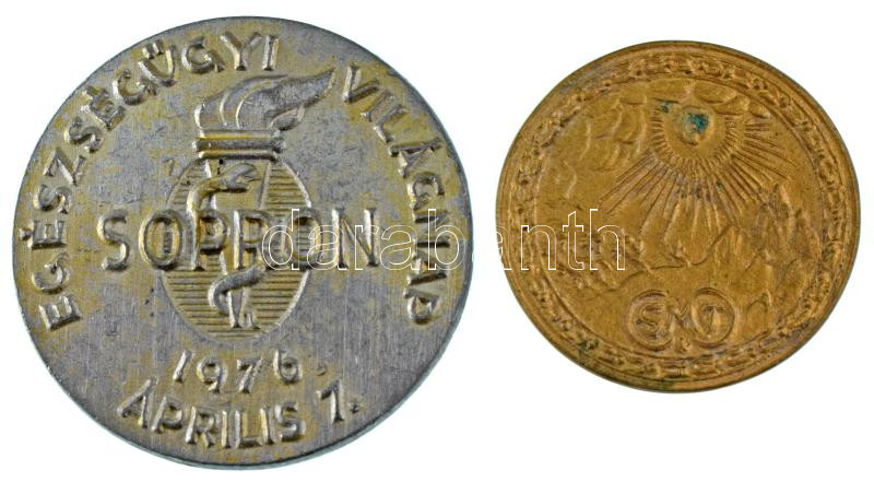 Leírás: Kutas László (1936-2023) 1990. "Soproni Nemes Társaság 200 éves" kétoldalas, öntött bronz emlékérem (65mm) + 1976. "Egészségügyi Világnap Sopron 1976. április 7." egyoldalas öntött, ezüstözött bronz emlékérem (85mm) T:XF kopott ezüstözés