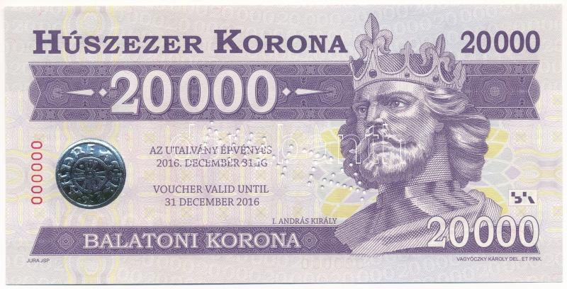 Leírás: 2012. 20.000K "Balatoni Korona", helyi pénz "000000" sorszámmal, "MINTA" perforációval T:UNC