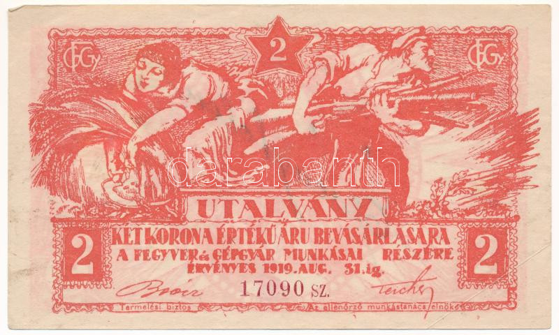 Budapest 1919. 1K "Fegyver és Gépgyár" utalvány, "Érvén... https://www.darabanth.com/hu/475-Gyorsarveres/475.0/Numizmatika/Papir-es-fem-szuksegpenzek~2000008/Budapest-1919-1K-Fegyver-es-Gepgyar-utalvany-Ervenytelen-fekete-kezirassal-TXF-hajta~II3207096